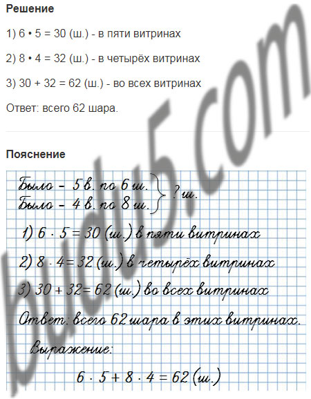 191. Для украшения витрин магазина в них поместили шары: в 5 витрин по 6 шаров и в 4 витрины по 8 шаров. Сколько всего шаров во всех этих витринах?