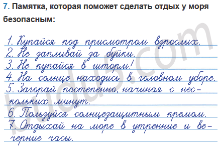 7. Мудрая Черепаха предлагает тебе задание. Используя текст учебника (с. 98 – 99), составь памятку, которая поможет сделать отдых у моря безопасным. Если будешь отдыхать у моря, обязательно выполняй эти правила.